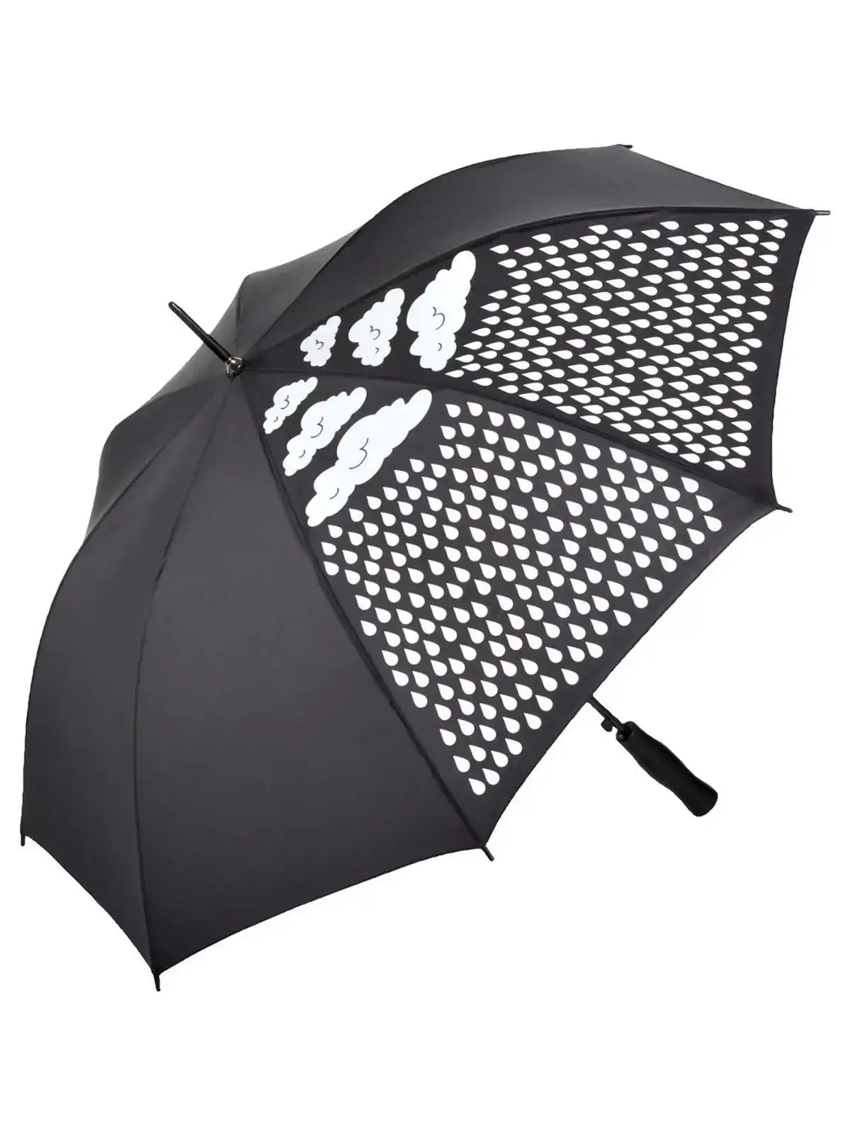 Fodera con stampa speciale su due spicchi: nuvole da pioggia bianche in caso di sole, un coloratissimo arcobaleno in caso di pioggia. Stecche flessibili in fibra di vetro, confortevole funzione automatica per un'apertura rapida, propriet�� Windproof per una maggiore flessibilit�� del telaio e migliore resistenza al vento, maggiore protezione contro la corrosione grazie alla galvanizzazione nera del bastone in acciaio, premaito con il marke(ding) Award 2012. Diametro: 105 cm, lunghezza da chiuso: 84 cm, 8 pannelli.