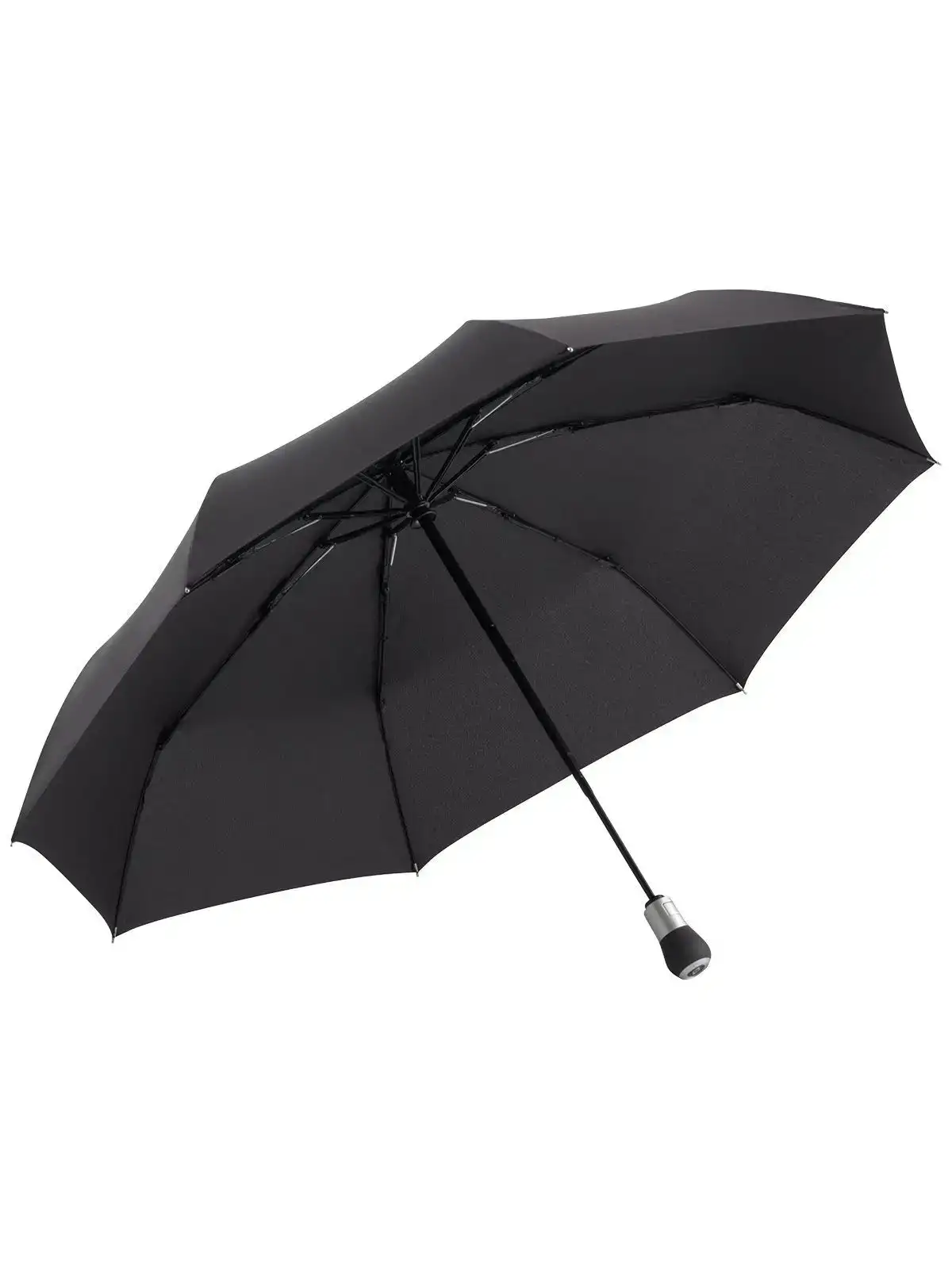 Manico argentato opaco a forma di pulsante con possibilit�� di applicazione della pubblicit�� (p.es. slitta di azionamento), occhiello nella speciale finitura grigio scuro, bastone stabile in fibra di vetro e plastica, pregiate stecche in fibra di vetro e plastica, confortevole doppia funzione automatica per l'apertura e la chiusura rapida, sistema Windproof per una flessibilit�� del telaio massima in caso di forti raffiche di vento, propriet�� della fodera idrofughe e autopulenti grazie al rivestimento in tessuto DuPont�?? Teflon�� originale, pratica custodia con bottone a pressione. Diametro: 105 cm, lunghezza da chiuso: 32 cm, 8 pannelli.