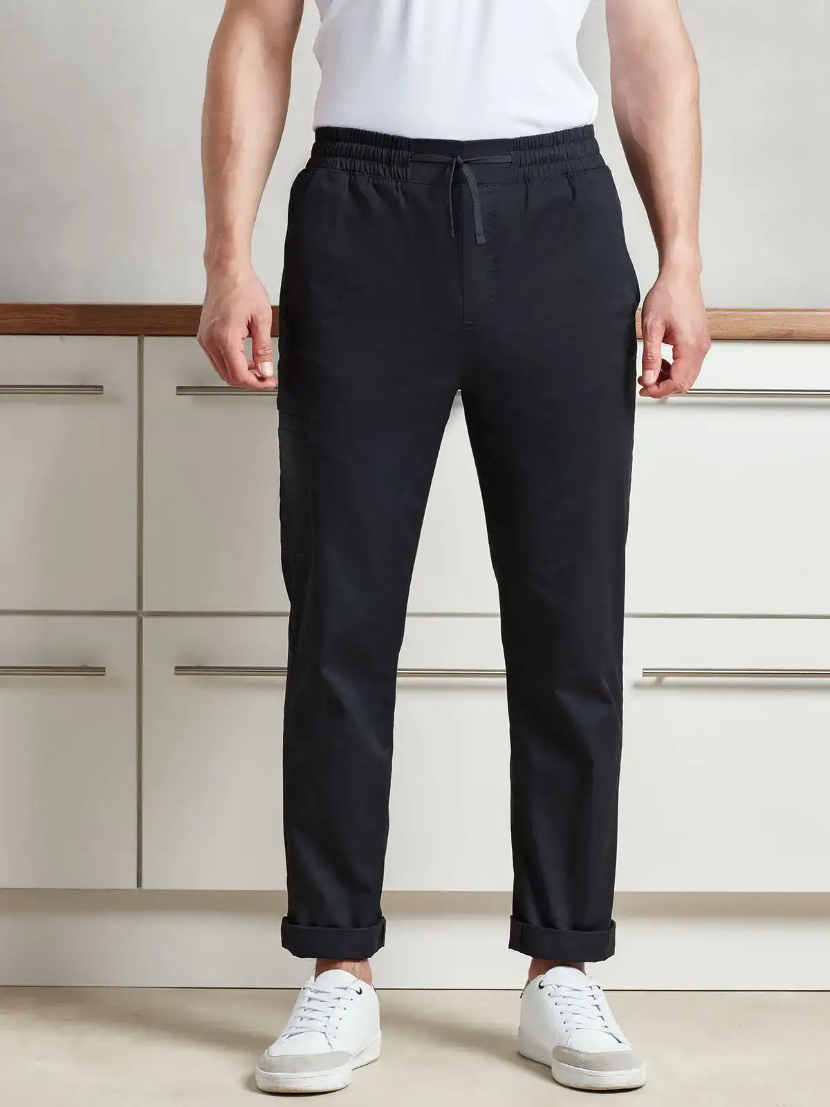 65% poliestere riciclato, 35% cotone. Pantaloni cargo da chef in tessuto policotone riciclato, con vita elasticizzata e coulisse, finta patta con cucitura, molteplici tasche, taglio affusolato nella parte inferiore della gamba con orlo risvoltabile.