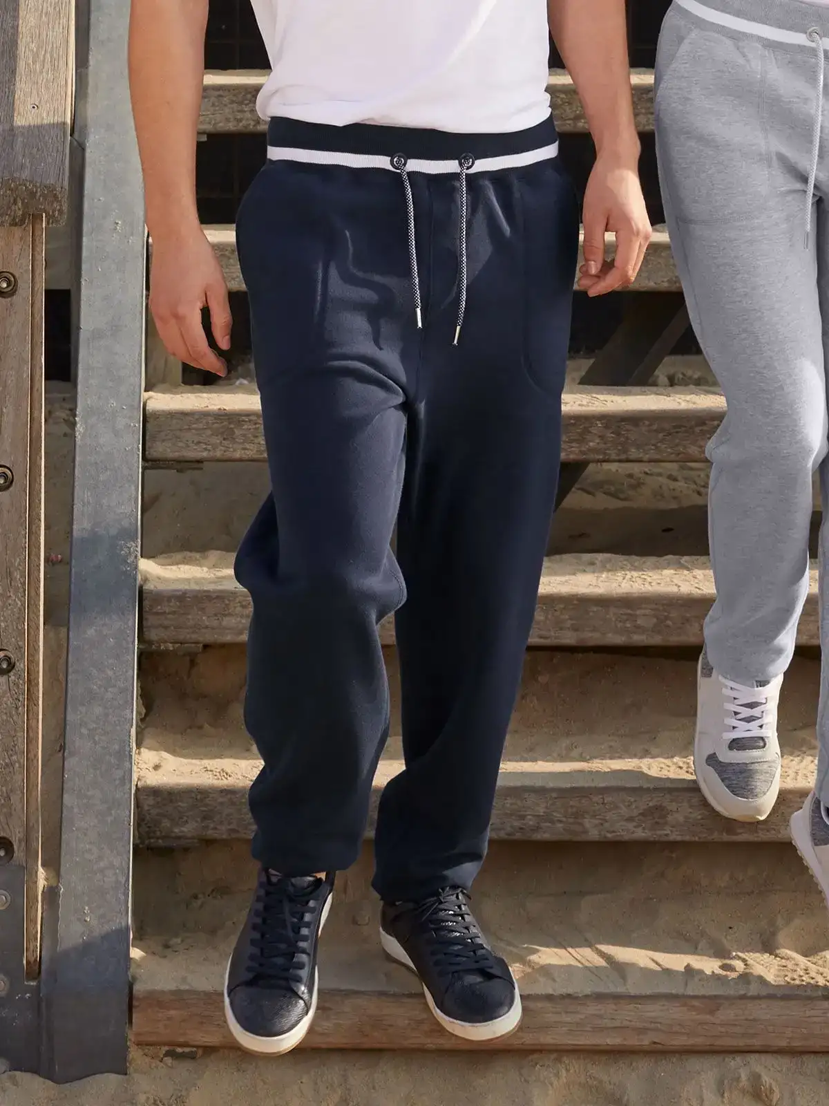 80% cotone, 20% poliestere. Panta da jogging trendy. Tessuto morbido e di alta qualit��, felpato internamente, polsini a maglia di elastan, strisce contrastanti nei polsini e in vita, con cordone. 2 tasche laterali, 1 tasca sul retro.