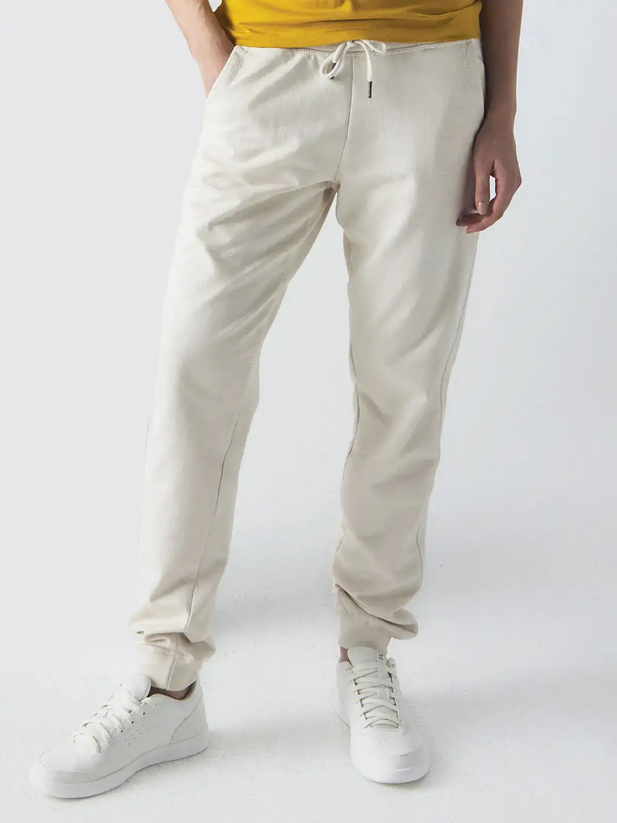 80% cotone, 20% poliestere. Pantaloni in felpa french terry, interno girovita e tasche in jersey, tasca posteriore applicata, fondo gamba a costine 1x1, cordini tondi tono su tono con punta in metallo, occhielli in metallo, impuntura flatlock su tutte le cuciture. Etichetta strappabile. Parte esterna: 100% cotone, parte interna: 50% cotone, 50% poliestere.