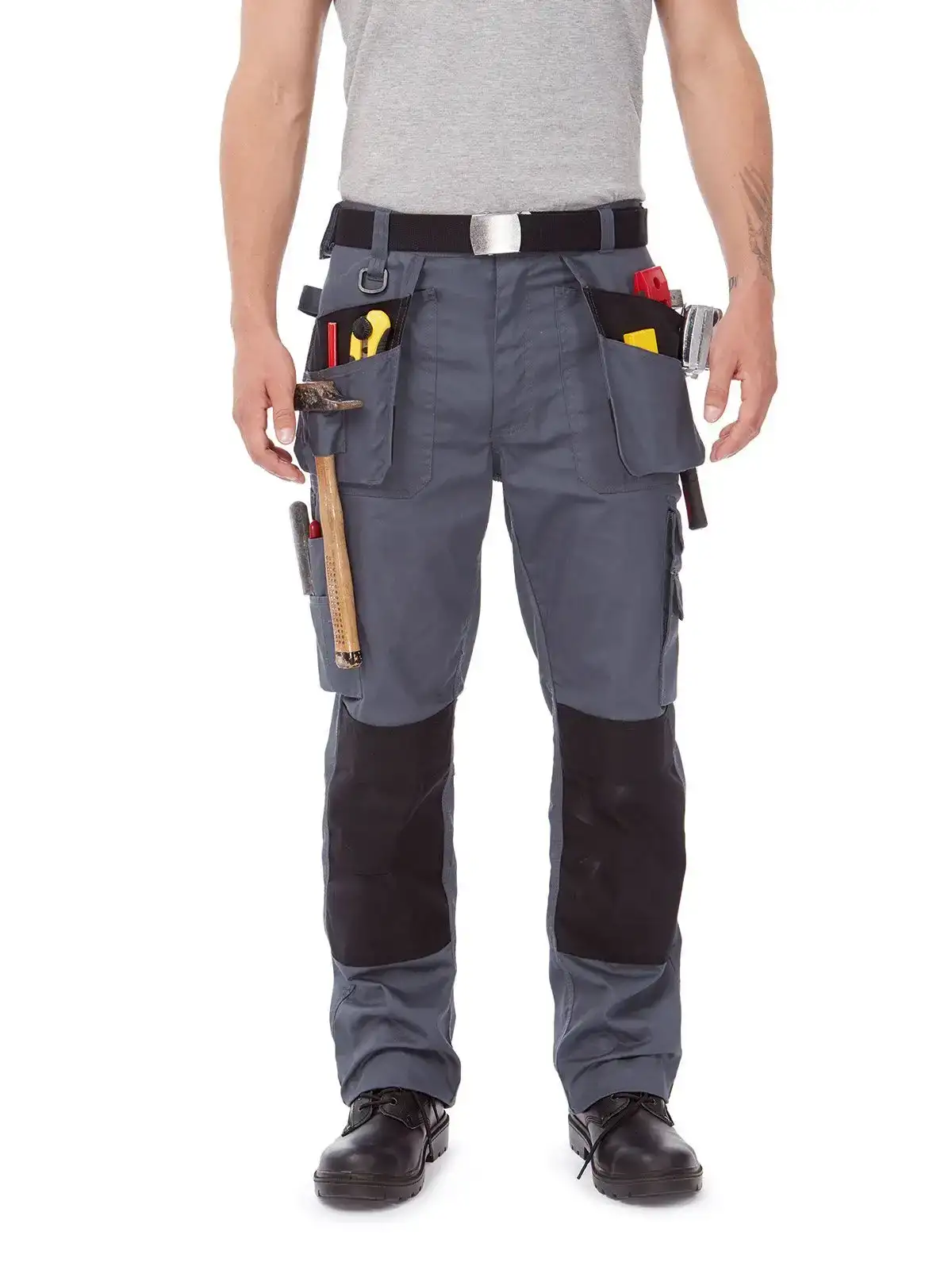 65% poliestere, 35% cotone Twill. Pantaloni con tasche porta ginocchiere, tasche volanti che si possono inserire in tasche pi�� profonde se non utilizzate, girovita posteriore con elastico, anello per portachiavi e altri oggetti, occhiello porta martello su entrambi i lati. Sistema in velcro per inserimento rapido di tasche porta oggetti. Cuciture triple rinforzate, resistenti ad abrasione e strappo.
