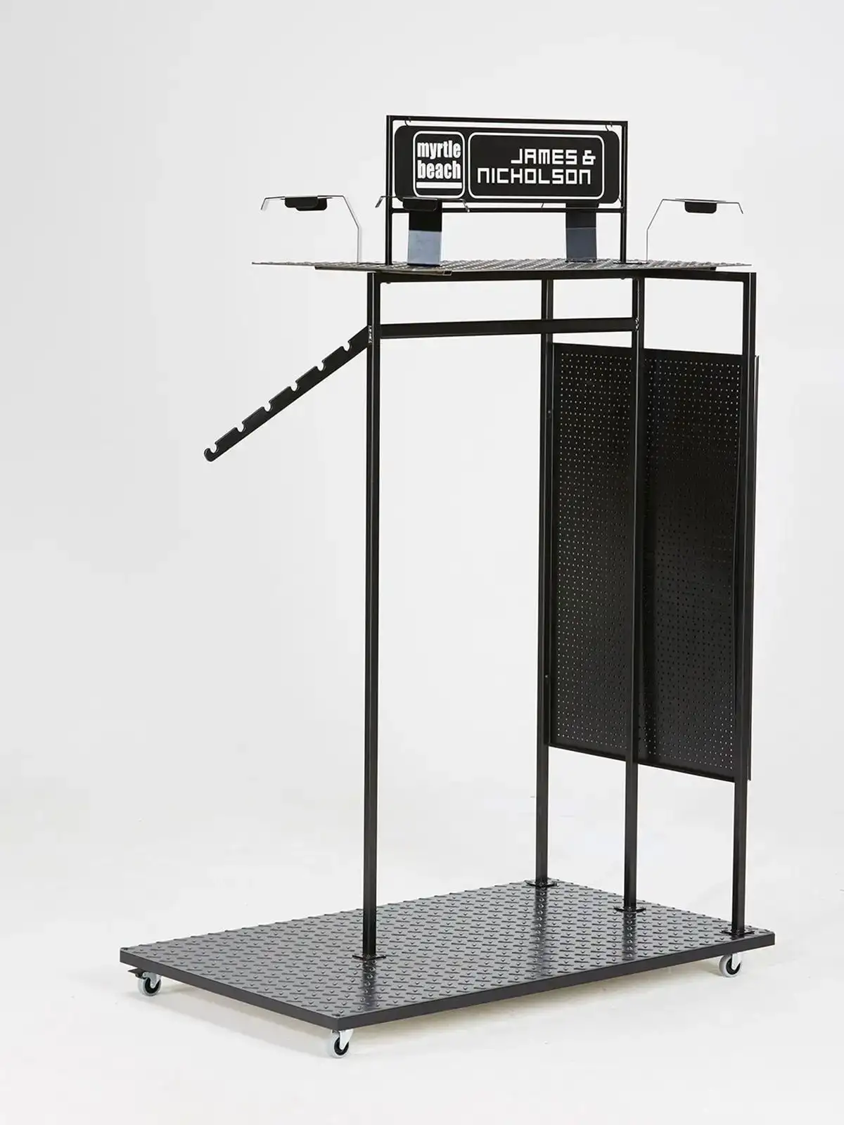 Appendiabiti classico con braccio laterale. Insegna in alto con il logo del marchio su entrambi i lati. Comoda cornice piegevole per poster A1. Spedito insieme a 4 fermagli e un porta-catalogo in plastica. Peso: ca 90kg. Dimensioni: 1,150mm x 700mm x 1,550mm