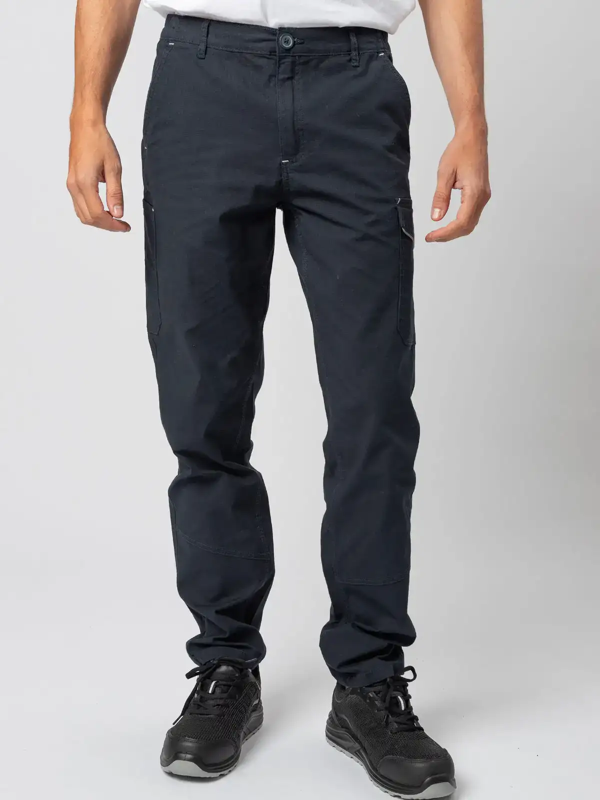 98% cotone, 2% elastane. Pantalone certificato CE CAT1, multitasche elasticizzato, tessuto prelavato, due tasche anteriori, una tasca laterale con piping e chiusura in Velcro, una tasca porta metro o portautensili, una tasca posteriore con piping riflettente e chiusura in Velcro. Inserto HiViz nel fianco e nel retro. Triple cuciture per una massima resistenza del capo, impunture di rinforzo in colore a contrasto. Due cuciture anteriori sotto il ginocchio, elastici in vita e passanti maggiorati. Etichetta strappabile.