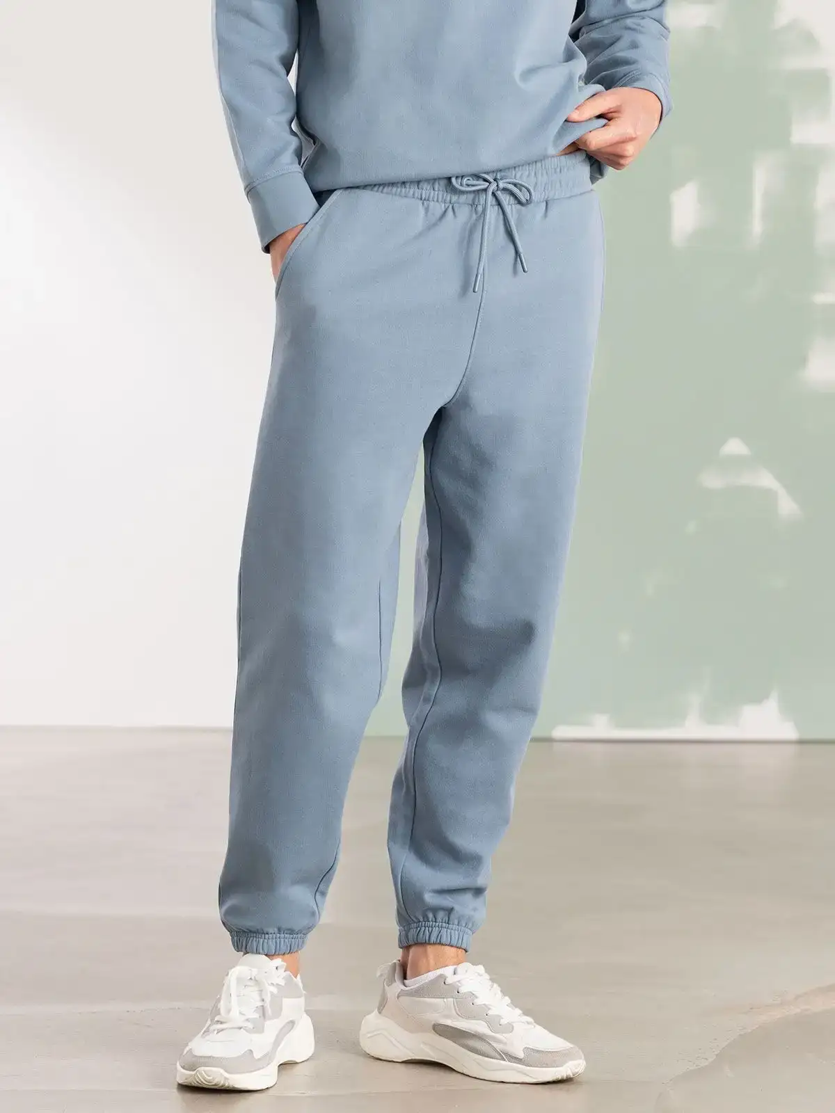 60% cotone rigenerato 40% poliestere riciclato. Pantaloni in felpa unisex dalla vestibilit�� ampia, felpati internamente. Vita e polsini elasticizzati, cordino tondo in vita, due tasche laterali, una tasca sul retro, cuciture in tinta. Etichetta senza brand. Busta riutilizzabile 100% plastica riciclata.