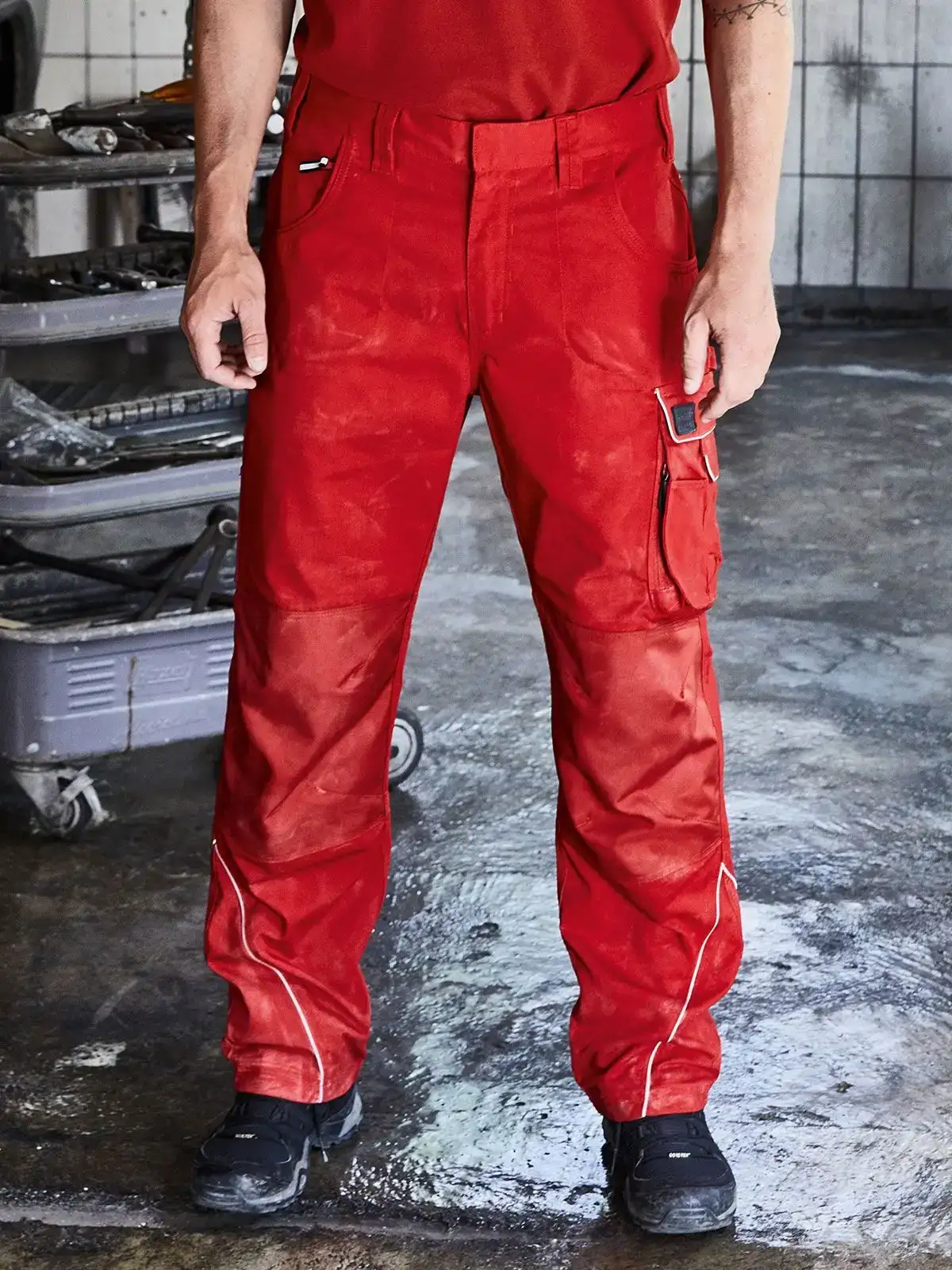 65% poliestere, 35% cotone, rifiniture 100% poliammide. Pantaloni da lavoro in tessuto misto resistente e robusto, girovita elastico con passanti per cintura, riforzo CORDURA sulle ginocchia, triple cuciture, tasche frontali, tasche porta attrezzi, due tasche con zip, taschino per cellulare, taschini porta-penna con rinforzo CORDURA, dettagli riflettenti (senza funzione protettiva / senza DPI) sulle tasche, sul davanti e sul retro, zip YKK, lavabile a 60�� C e ideale per asciugatura in asciugatrice. Per evitare che il prodotto si rovini, tutti i bottoni e le zip sono nascosti.