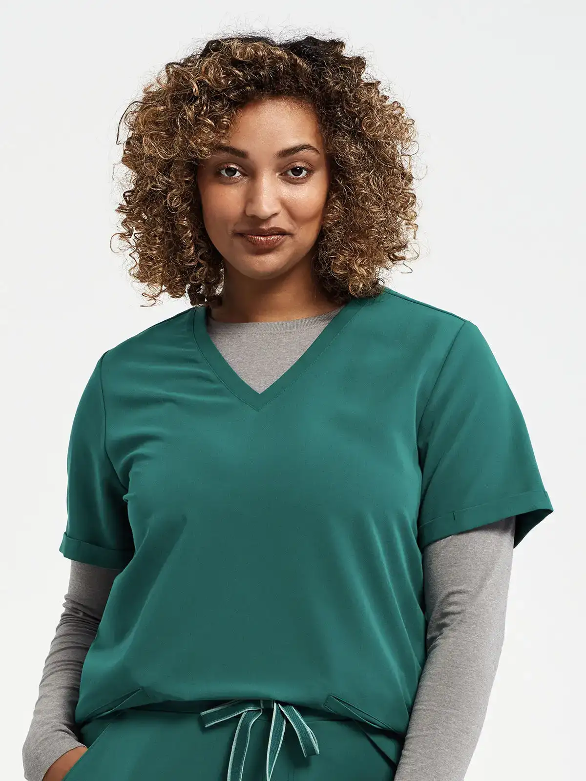 42% poliestere / 33% poliestere riciclato / 19% viscosa / 6% elastan. Collo a V. 2 ampie tasche sui lati. Spacchetti comfort laterali. Tessuto traspirante.