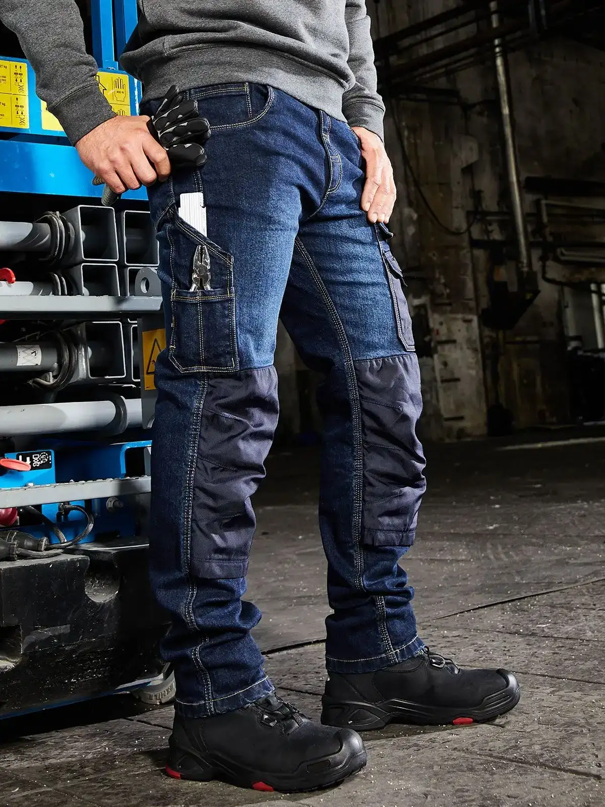Tessuto esterno: 85% cotone organico, 13% poliestere riciclato, 2% elastan, Inserti: 100% poliammide. Jeans robusti con taglio dritto, passanti per cintura sulla vita, tasche imbottite sulle ginocchia rinforzate con CORDURA, cuciture triple, 2 tasche laterali con porta-monete, 2 tasche posteriori, tasche porta-attrezzi, porta- penne, porta-cellulare, zip: YKK.